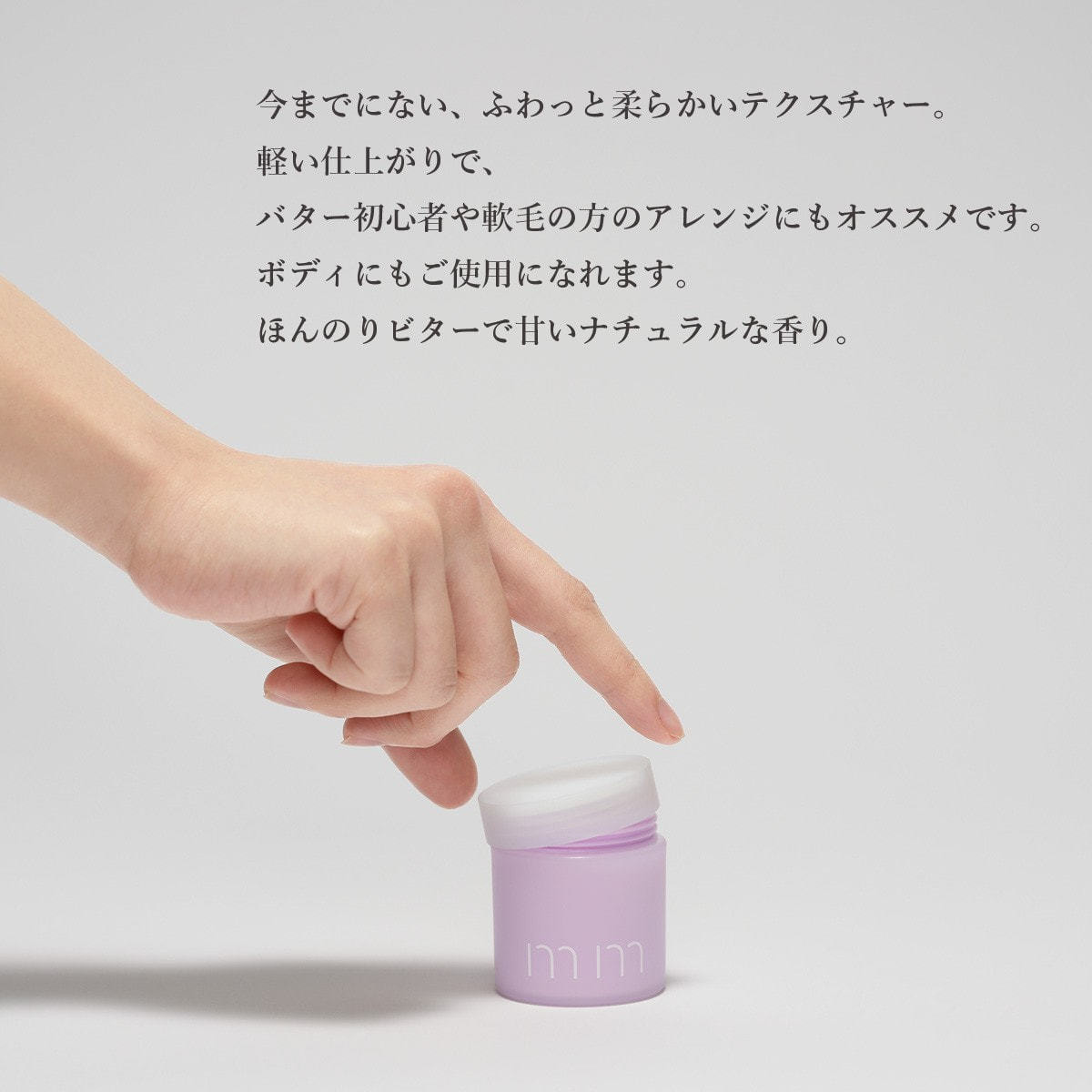 植物由来のさらさらパウダーや、べたつきの少ない保湿剤・油によってべたつかないスタイリングを可能にしました。